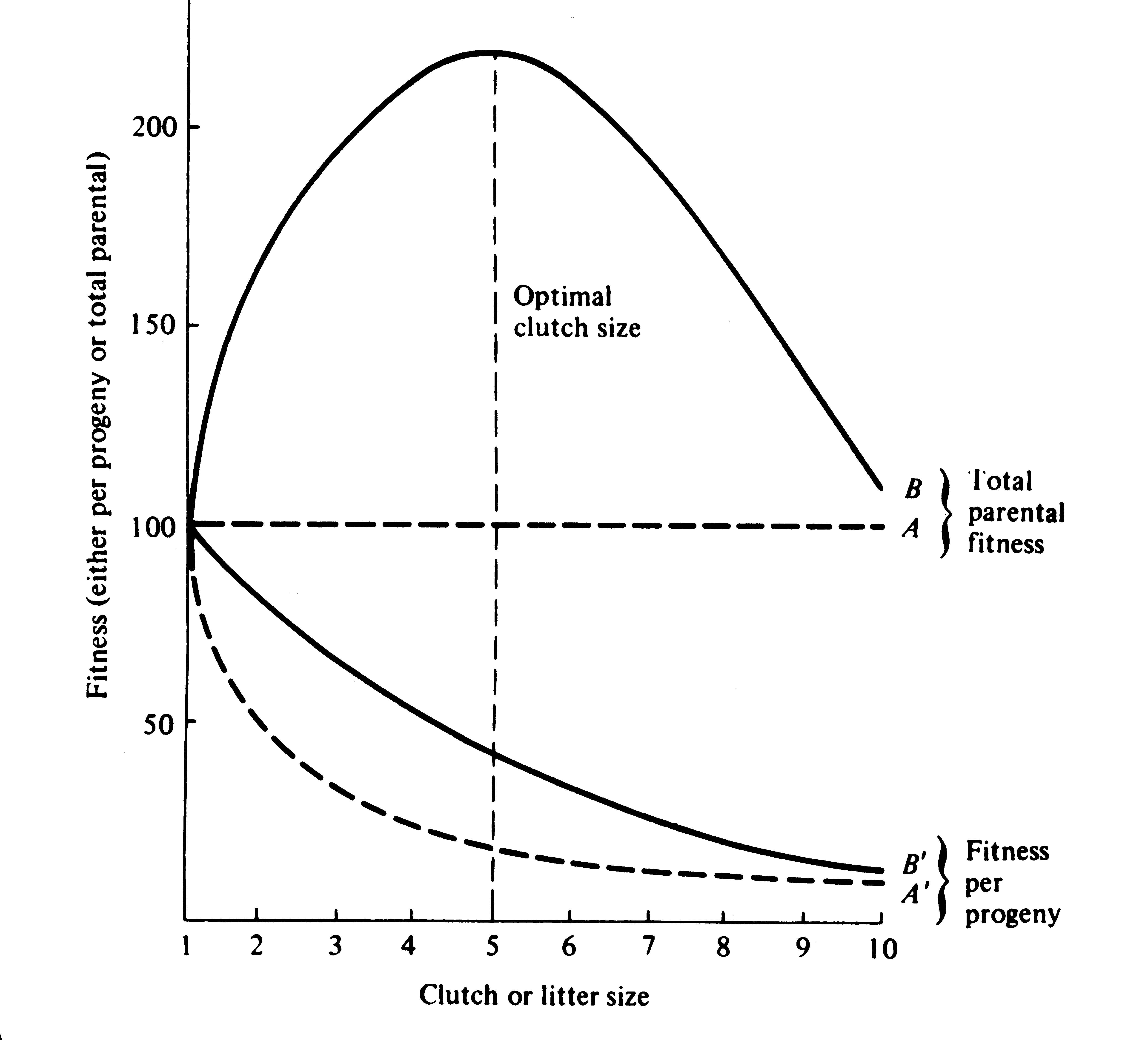 A simple graphical model illustrates this fundamental tradeoff between quantity and quality of offspring (Figures). In the unlikely event that progeny fitness increases linearly with parental expenditure (dashed line A in left Figure), fitness of individual progeny decreases with increased clutch or litter size (the lowermost dashed curve A in right Figure). However, because parental fitness (the total of the fitnesses of all progeny produced) is flat, no optimal clutch size exists from a parental viewpoint (upper dashed line A in right Figure). Gains in progeny fitness per unit of parental investment are likely to be greater at lower expenditures per progeny than at higher ones because the proportional increase per unit of allocation is greater at low levels of investment; curves level off at higher expenditures due to the law of diminishing returns. If the biologically plausible assumption is made that progeny fitness increases sigmoidally with parental investment (curve B in left Figure), there is an optimal parental clutch size (peak of uppermost curve B in right Figure). In this hypothetical example, parents that allocate only 20 percent of their reproductive effort to each of five offspring gain a higher total return on their investment than parents opting for any other clutch size (right Figure). Such curves have been demonstrated for starlings and swifts (Lack 1954) Although such a tactic is optimal for parents, it is not the optimum for individual offspring, which would achieve maximal fitness when parents invest everything in a single offspring. Hence, a "parent-offspring conflict" exists (Trivers 1974). The exact shape of the curve relating progeny fitness to parental expenditure in any real organism is influenced by a virtual plethora of environmental variables, including length of life, body size, survivorship of adults and juveniles, population density, and spatial and temporal patterns of resource availability. The competitive environment of immatures is likely to be of particular importance because larger, better-endowed offspring should usually enjoy higher survivorship and generally be better competitors than smaller ones. In addition to clutch size and female total investment in reproduction, the size (or weight) of an individual oviductal egg or newborn progeny, also varies widely among lizards from as little as 1-2% in some species to a full 17% in the live-bearing Kalahari fossorial skink Typhlosaurus gariepensis. Such expenditures per progeny are inverse measures of the extent to which a juvenile lizard must grow to reach adulthood. Clutch or Litter Size Juveniles and adults are often subjected to very different selective pressures. Reproductive effort should reflect environmental factors operating upon adults, whereas expenditure per progeny will be strongly influenced by juvenile environments. Because any two parties of the triumvirate determine the third, an optimal clutch or litter size is a direct consequence of an optimum current reproductive effort coupled with an optimal expenditure per progeny (indeed, clutch size is equal to reproductive effort divided by expenditure per progeny). Of course, clutch size can be directly affected by natural selection as well. For example, it has been suggested that all members of the lizard genus Anolis lay but a single egg because the ancestral stock was arboreal and encountered intense selection against being weighted down by a heavy egg load, becoming genetically fixed at a clutch size of one (Andrews and Rand 1974). Any two parties to this triad (clutch size, female reproductive investment, and expenditure per progeny) uniquely determine the third: however, forces of natural selection molding each differ substantially. Thus clutch or litter weight presumably reflects an adult female's best current investment tactic in a given environment at a particular instant in time whereas expenditure on any given individual progeny is probably more closely attuned to the average environment to be encountered by a juvenile. In a sense, then, clutch (or litter) size is the direct result of the interaction between an optimal parental reproductive tactic and an optimal juvenile body size (clutch size is simply the ratio of the former divided by the latter). Statistics on clutch/litter sizes, total reproductive investment of females, and expenditure per progeny among 65 species of desert lizards were presented by Pianka (1986), along with similar data on another 20 species of lizards, including both desert and non-desert forms extracted from the literature. Among the species surveyed, average clutch/litter size varies from 1 in the Kalahari skink Typhlosaurus gariepensis and the geckos Gehyra variegata and Ptenopus garrulus to 13 in the Kalahari agamid Agama aculeata. Clutch sizes in certain horned lizards are still larger, averaging 24.3 in the American iguanid Phrynosoma cornutum (the Texas horned lizard). Clutch or litter size and female investment are significantly positively correlated (r = .482, P < .001), although scatter is considerable. Viviparous species (mostly skinks) tend to have slightly higher investment ratios than do the egg layers. Since expenditure per progeny can be estimated from total investment divided by clutch/litter size, it tends to decrease exponentially with increasing number of progeny (for a fixed total investment). Expenditure per progeny and clutch/litter size are inversely related (r = -.652 P < .001). This correlation is strengthened when both variables are transformed to logarithms (on a log-log plot, the correlation coefficient is -.810). Clutch size is thus correlated positively with total investment but negatively with investment per progeny. In simple product-moment correlation, the latter two members of the triumvirate, total reproductive investment and expenditure per progeny, are only weakly and not significantly correlated (r = .153, P < .10), suggesting that these two parameters vary independ