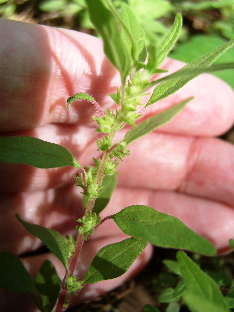 | habit - low-growing annual | leaf blades rhombic-lanceolate, minutely scabrous-pubescent, sticking to fingers and clothes |