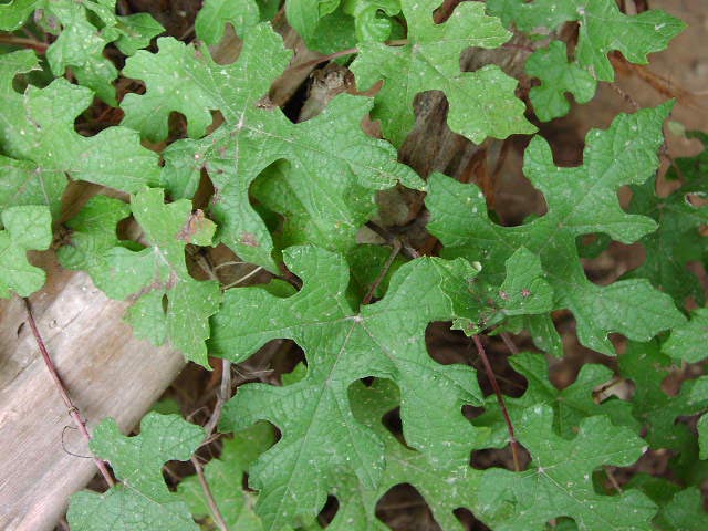 | more leaves--these leaves are deeply lobed in this individual. In Vitis mustangensis, the leaves can vary greatly in the amount of lobing, even within the same individual! | leaves and tendrils--notice how the tendrils are opposite the leaves |
